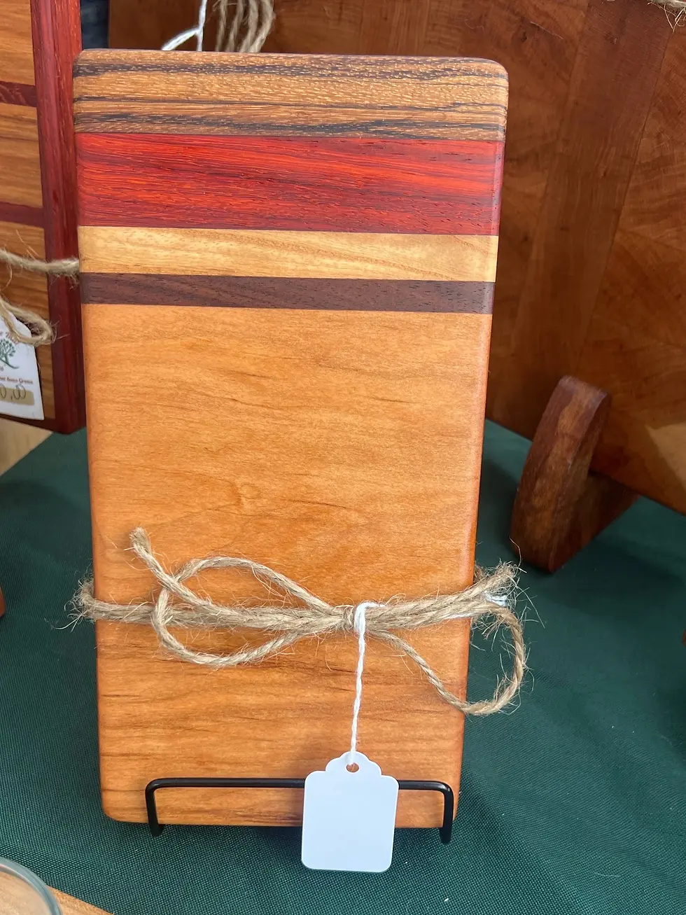 Handcrafted cutting board made from sycamore, cherry, padauk, maple & zebra wood. Can also be used as cheese/serving board. Features rounded corners. Finished with food safe mineral oil and conditioned with Bumblechutes All-in-One Wood Conditioner (may contain traces of coconut oil and tree nuts)